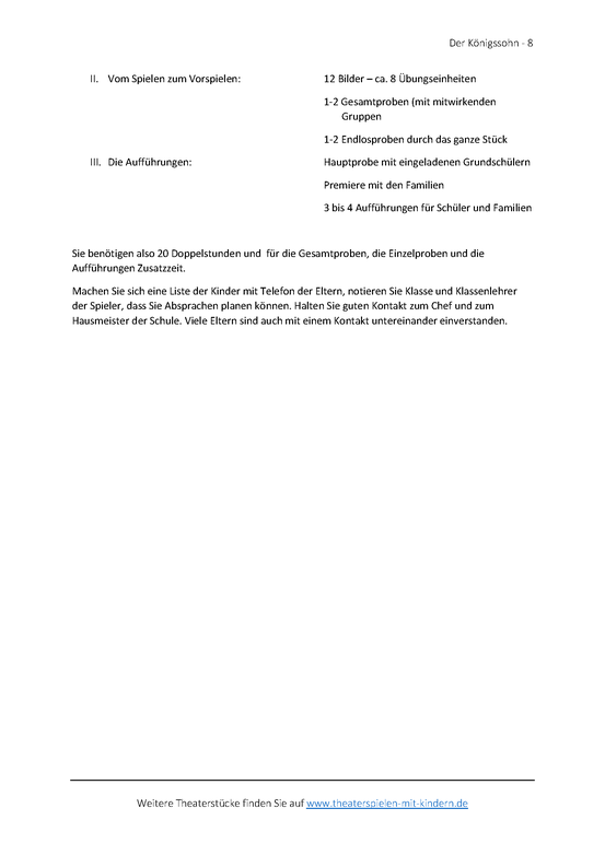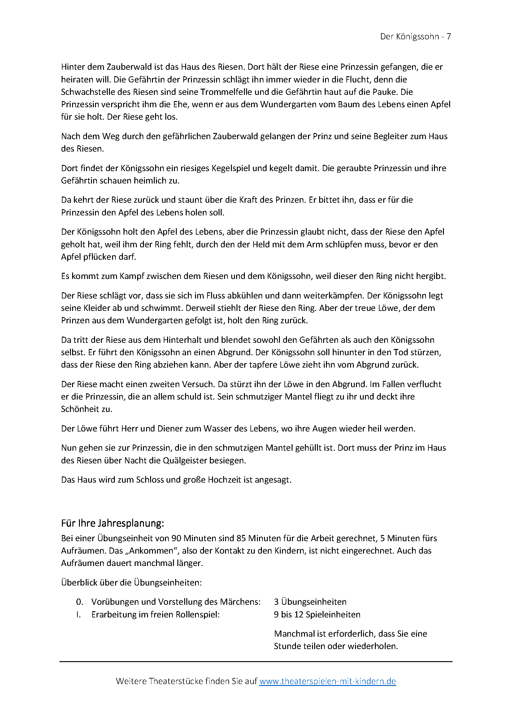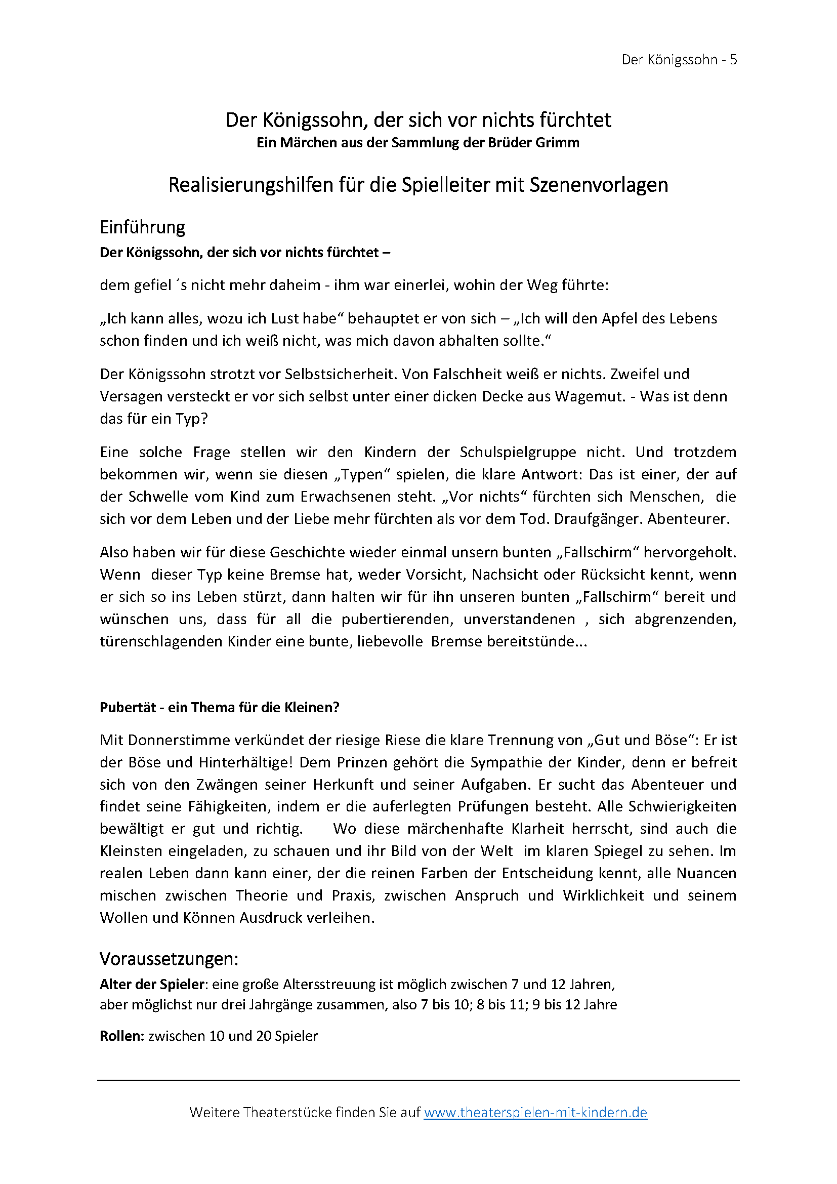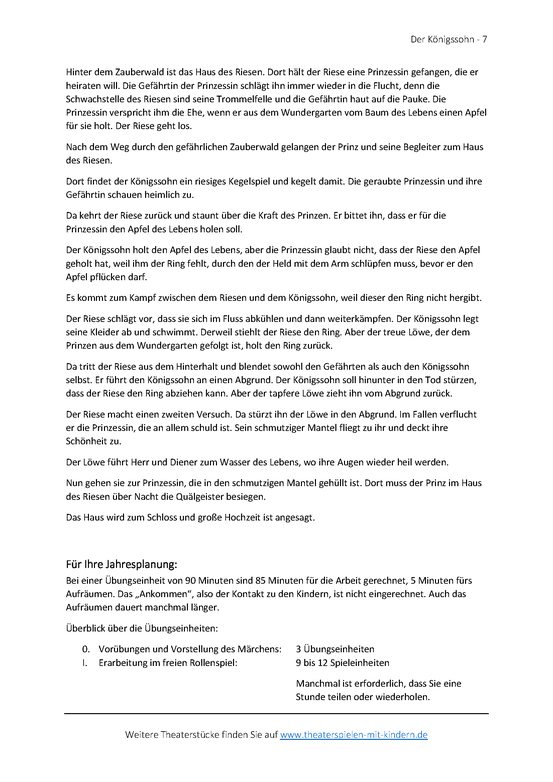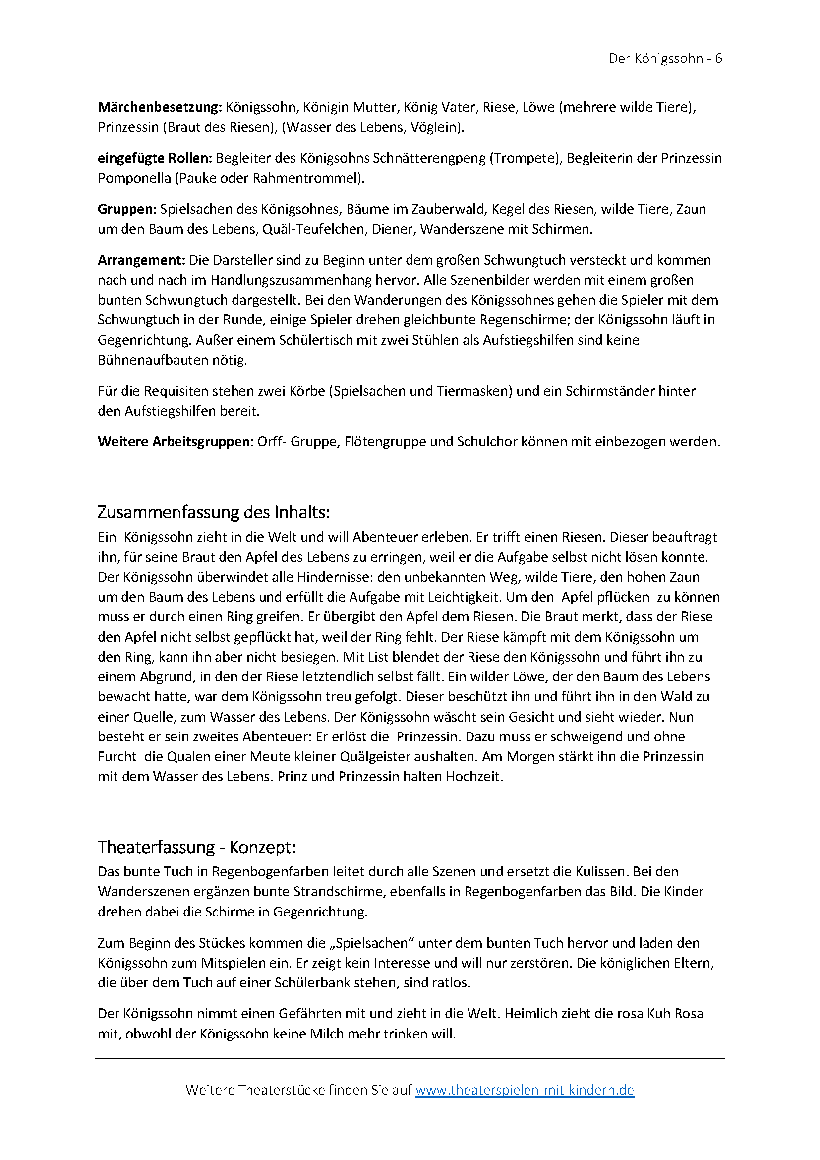 Märchenbesetzung: Königssohn, Königin Mutter, König Vater, Riese, Löwe (mehrere wilde Tiere), Prinzessin (Braut des Riesen), (Wasser des Lebens, Vöglein).