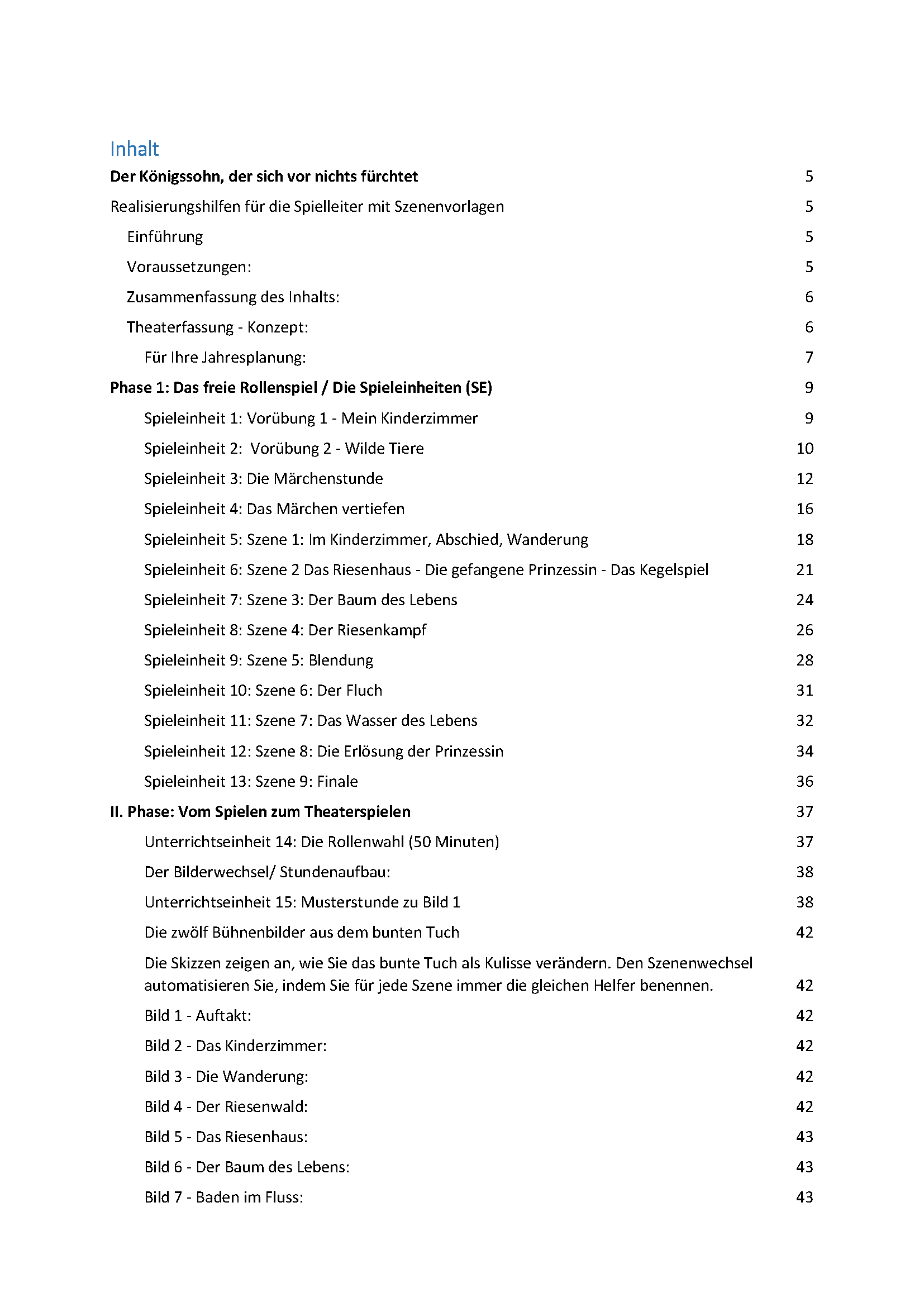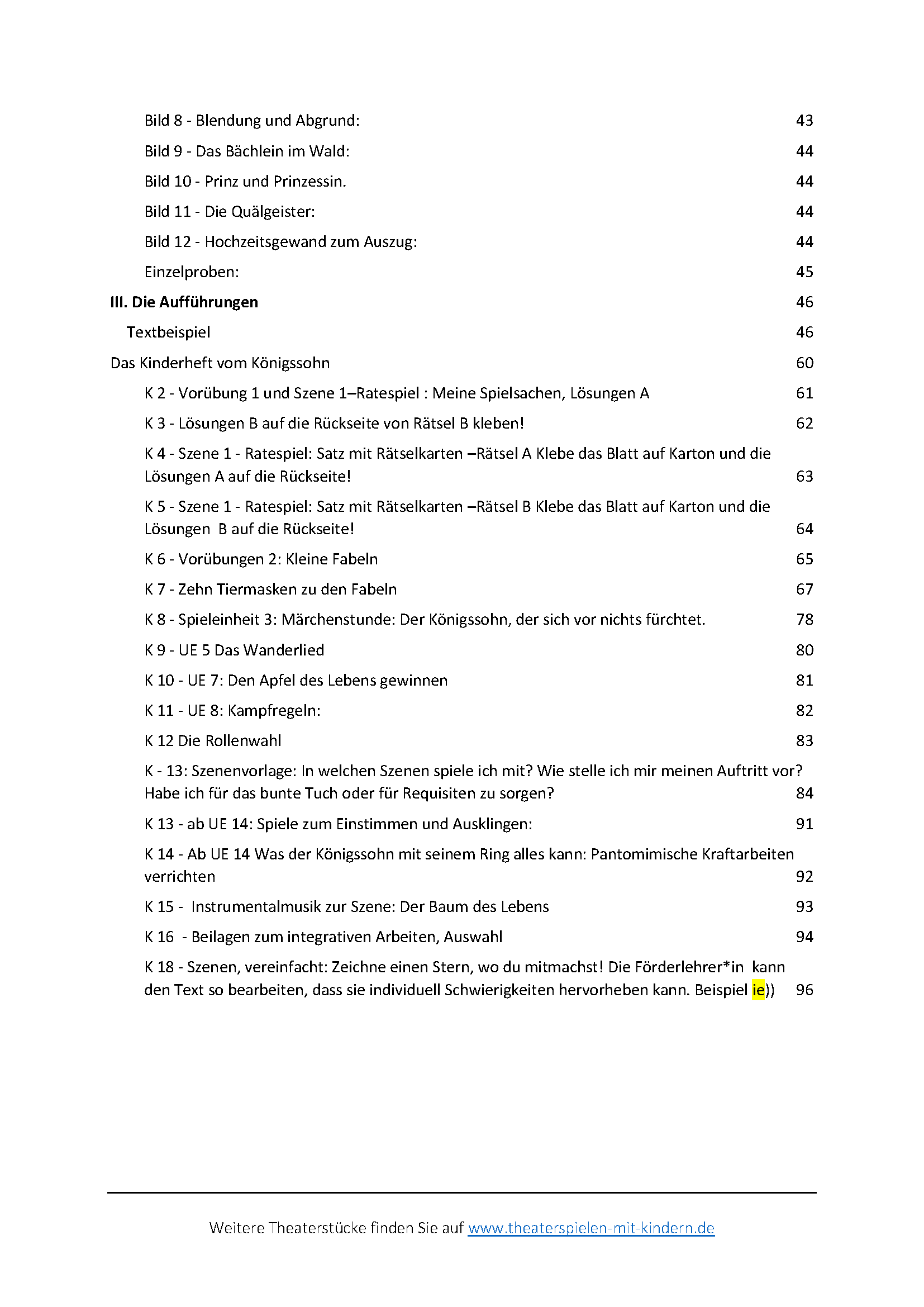 Gruppen: Spielsachen des Königsohnes, Bäume im Zauberwald, Kegel des Riesen, wilde Tiere, Zaun um den Baum des Lebens, Quäl-Teufelchen, Diener, Wanderszene mit Schirmen.