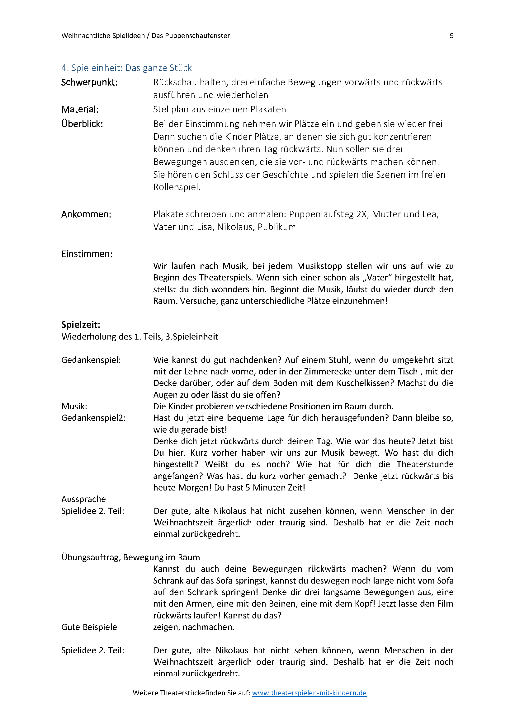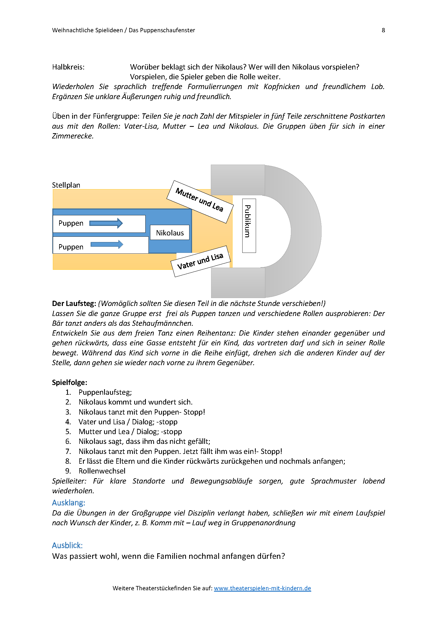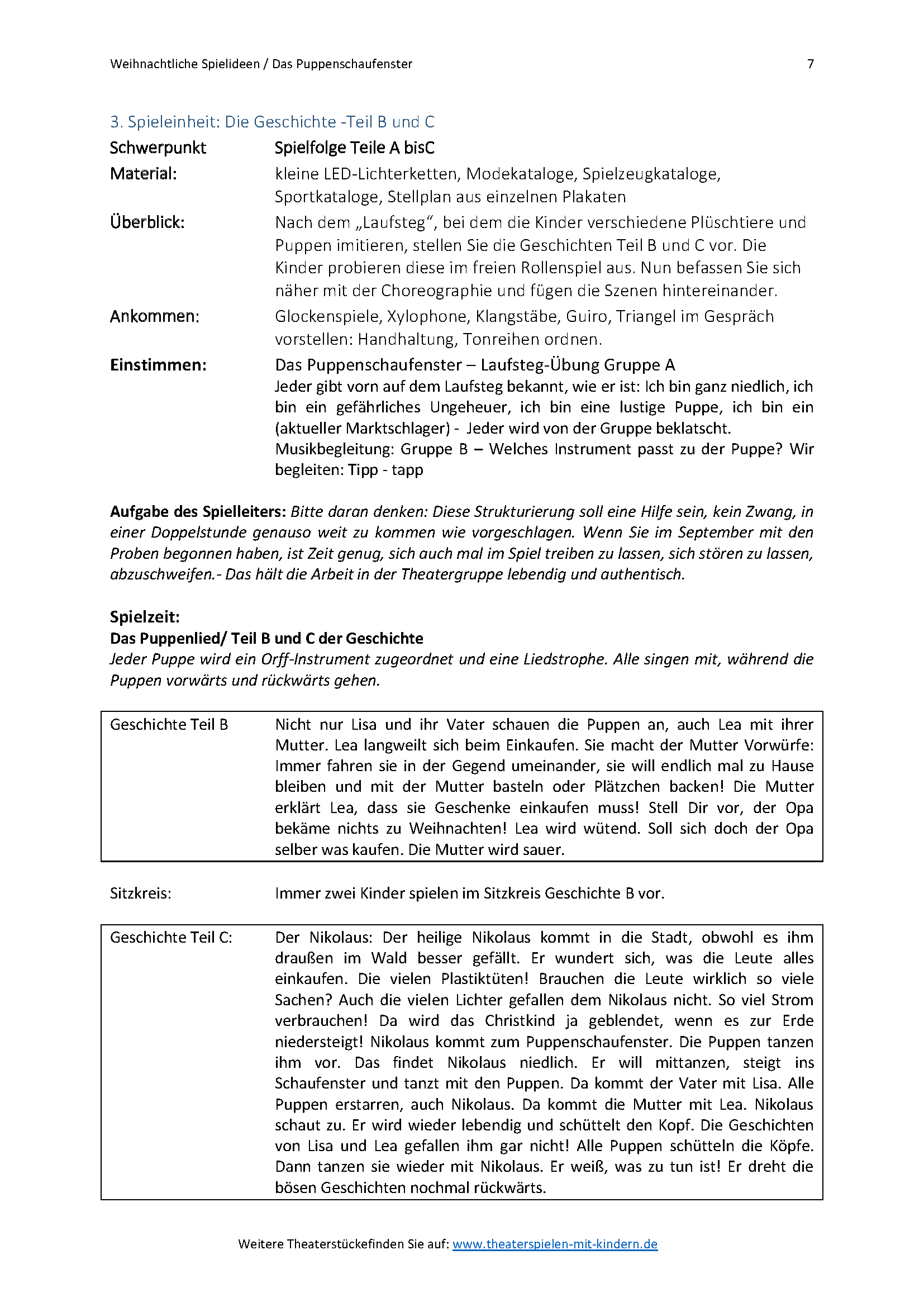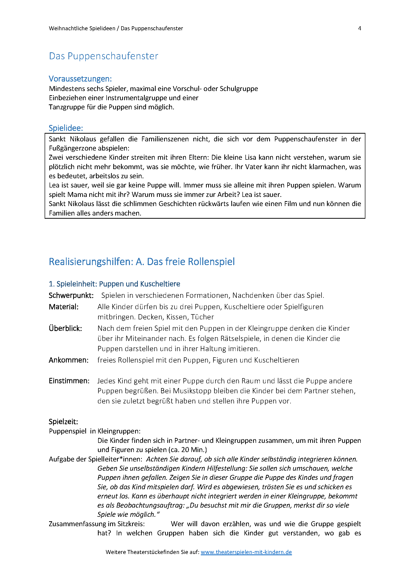 Einbeziehen einer Instrumentalgruppe oder Tanzgruppe für die Puppen sind möglich.